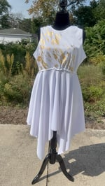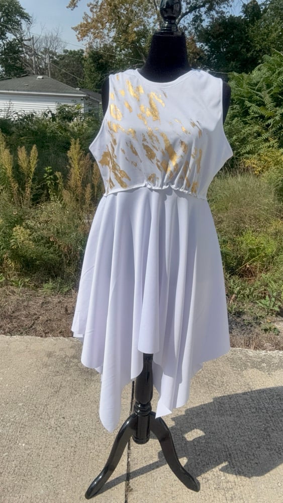 This piece is a visual representation of purity, power, and divine purpose. The hand-applied gold strokes gleam like heavenly fire, making every movement in dance or intercession reflect light and truth.